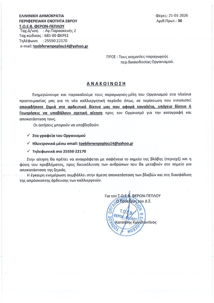 Ο ΤΟΕΒ Φερών – Πέπλου ενημερώνει τα μέλη του ότι, ενόψει της νέας καλλιεργητικής περιόδου, είναι απαραίτητη η έγκαιρη καταγραφή τυχόν ζημιών στο αρδευτικό δίκτυο. Οι παραγωγοί παρακαλούνται να υποβάλουν αιτήσεις για οποιαδήποτε βλάβη σε καναλέτες, υπόγειο δίκτυο ή γεωτρήσεις, ώστε να προγραμματιστεί η άμεση αποκατάστασή τους.