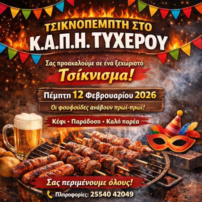 Το ΚΑΠΗ Τυχερού καλεί όλους τους κατοίκους και φίλους του την Πέμπτη 12 Φεβρουαρίου να συμμετάσχουν στο παραδοσιακό τσίκνισμα της Τσικνοπέμπτης.