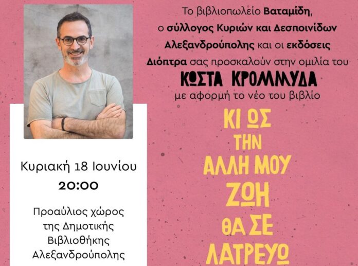 Σε συνεργασία με το Σύλλογο Κυριών και Δεσποινίδων Αλεξανδρούπολης, φιλοξενούμε τον Κώστα Κρομμύδα για να μιλήσει για το νέο του συγκλονιστικό μυθιστόρημα