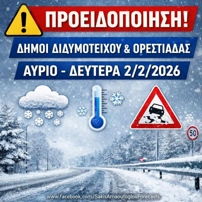 Η Δευτέρα 2 Φεβρουαρίου 2026 θα φέρει έντονα χειμωνιάτικα φαινόμενα στη βόρεια περιοχή του Έβρου, με κύρια επίδραση στους Δήμους Διδυμοτείχου και Ορεστιάδας, καθώς και στα ορεινά και βόρεια τμήματα του Δήμου Σουφλίου.