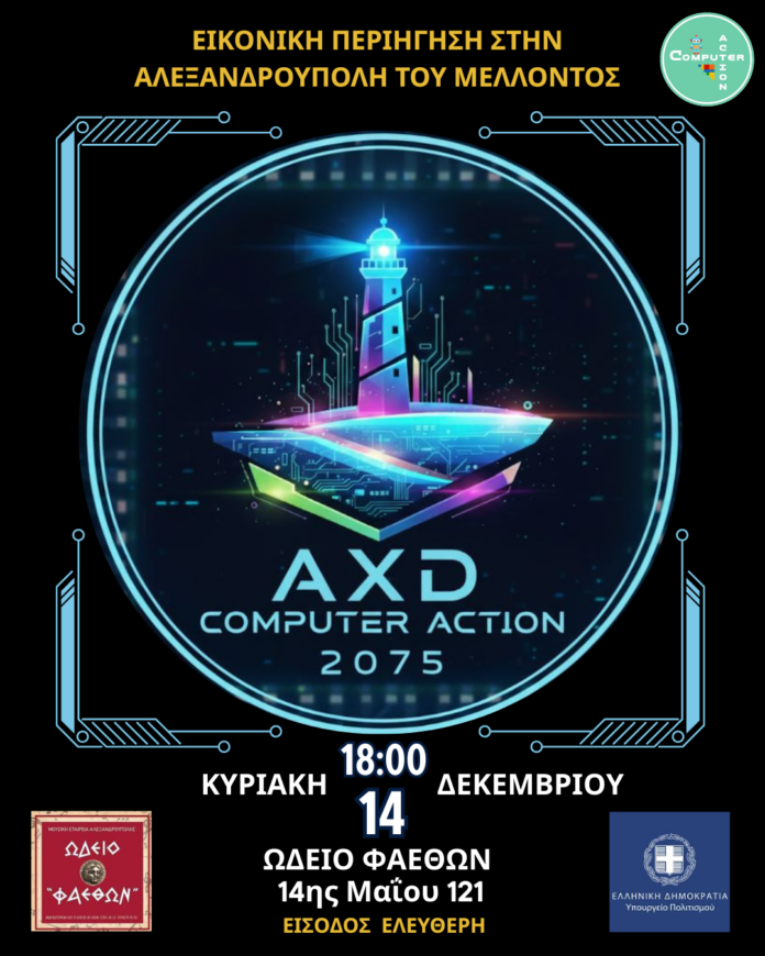 Την επίσημη παρουσίαση του πρωτοποριακού έργου «VR FUTURE AXD 2075 – Η Αλεξανδρούπολη του Μέλλοντος» διοργανώνουν η Ρομποτεχνολογία ΕνΔράσει και η Σχολή Computer Action, την Κυριακή 14 Δεκεμβρίου 2025, στις 18:00, στην Αίθουσα Εκδηλώσεων του Ωδείου «Φαέθων» της Μουσικής Εταιρείας Αλεξανδρούπολης.