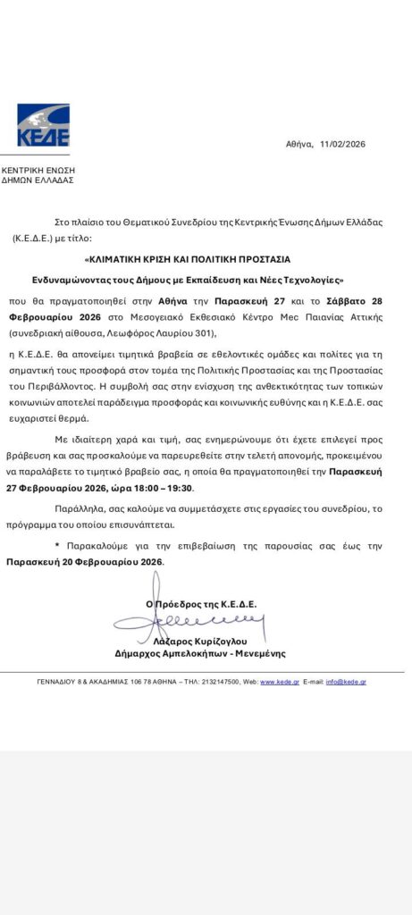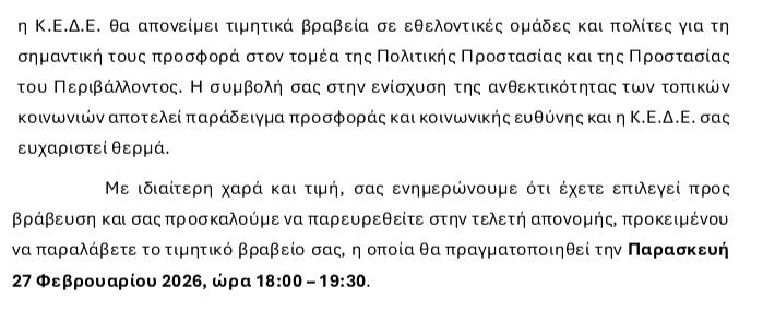 Το Εθελοντικό Πυροσβεστικό Κλιμάκιο βραβεύτηκε από την Κεντρική Ένωση Δήμων Ελλάδας (ΚΕΔΕ), σε αναγνώριση του έργου και της συνεισφοράς του στην τοπική κοινωνία.