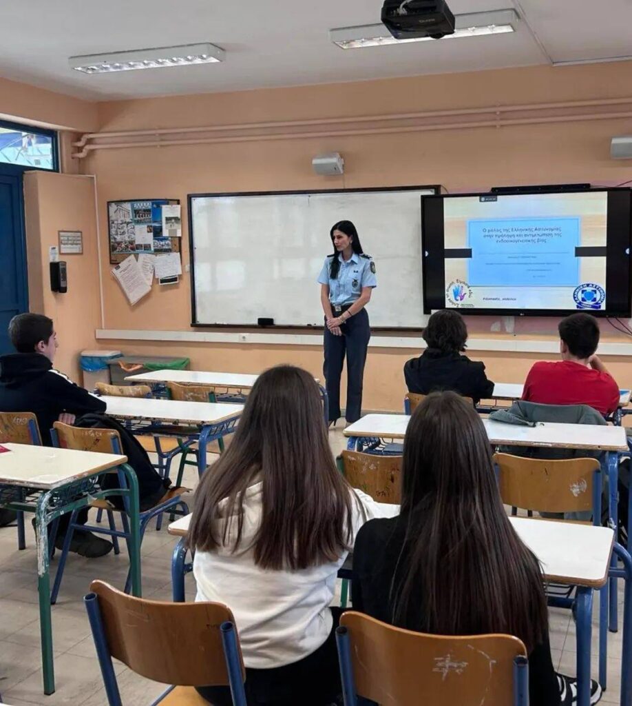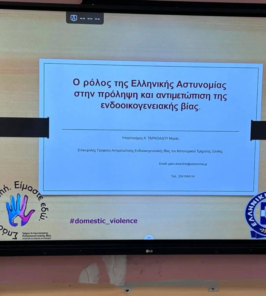 Η κ. Μαρία Ταρασιάδου, Υπαστυνόμος Α’ και προϊσταμένη του Αστυνομικού Τμήματος Ενδοοικογενειακής Βίας Ξάνθης, επισκέφθηκε το σχολείο και παρουσίασε με σαφήνεια και ευαισθησία τις διάφορες πτυχές του σοβαρού αυτού κοινωνικού ζητήματος.