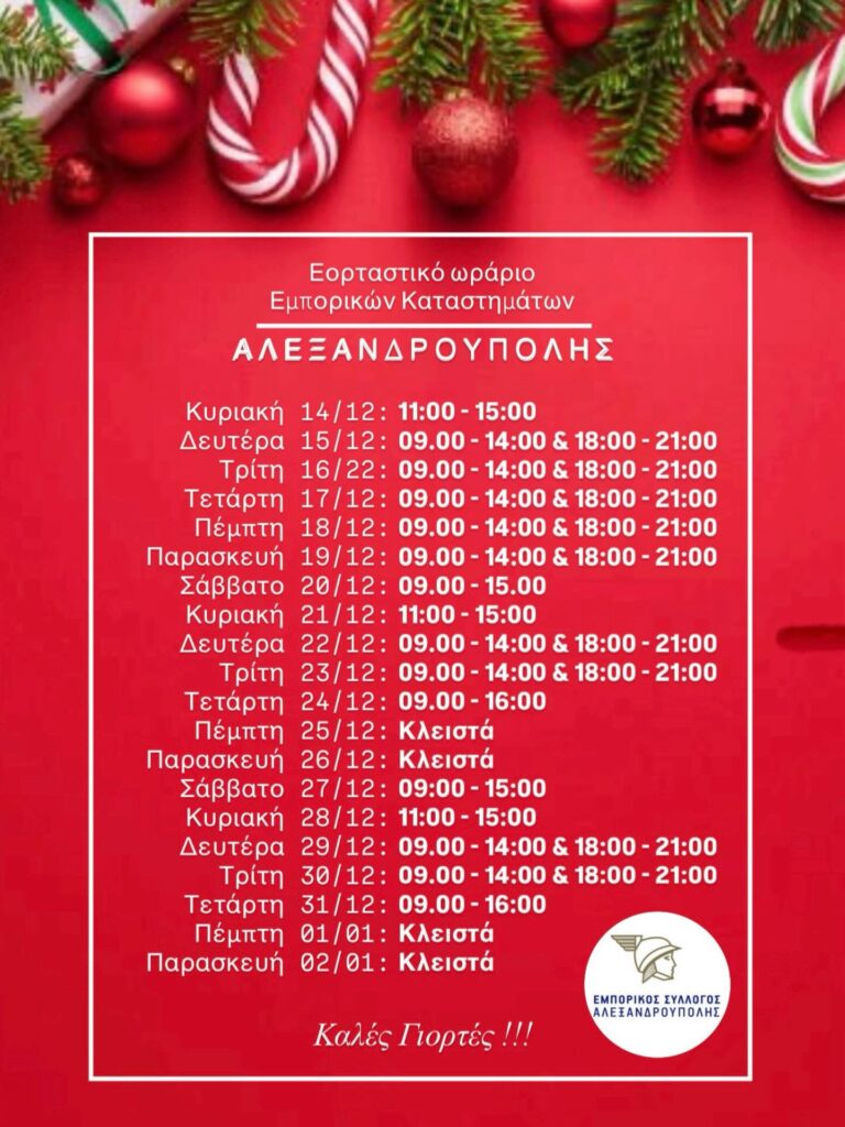 Για τη σημερινή Κυριακή 14 Δεκεμβρίου, καθώς και για τις επόμενες δύο (21/12 και 28/12), το προτεινόμενο ωράριο λειτουργίας για τα εμπορικά καταστήματα της Αλεξανδρούπολης είναι από τις 11:00 έως τις 15:00. Τις καθημερινές καθ’ όλη την περίοδο των εορτών, θα είναι ανοιχτά όλα τα απογεύματα από τις 18:00 έως στις 21:00.